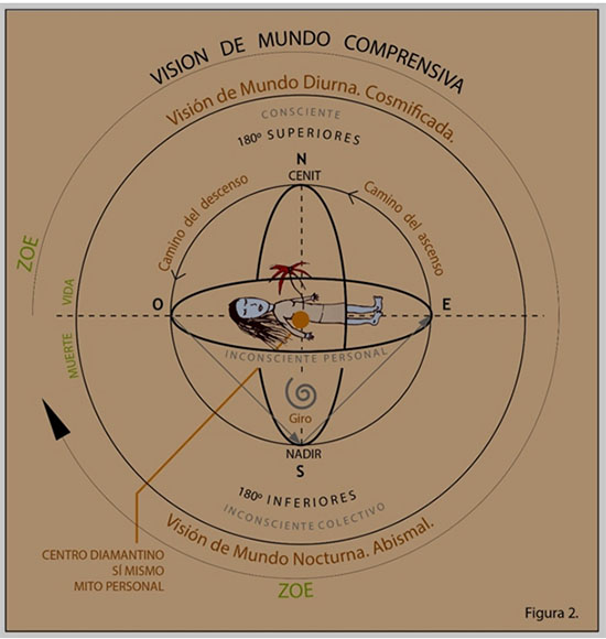 La experiencia de existir en el mundo siempre arroja en forma espontánea una visión, vale decir, una percepción interna de mundo o cosmovisión. Naturalmente, surge una imagen de mundo de la superficie y otra de los confines. Sin embargo, si bien se observan grandes avances en la psicología de lo inconsciente, es poco lo que se ha profundizado en la imago microcosmos/macrocosmos y en la imagen especular, ascendente/descendente de mundo. Por lo mismo es prudente y necesario avanzar hacia la visualización de una cosmovisión que incluya lo superior y lo inferior de la gran esfera de la realidad. Esta visualización debe comprender lo que vemos en la superficie del mundo, con sus hitos necesarios para el ascenso, como también la profundidad del mundo, con sus hitos necesarios para el descenso, Muerte y retorno.